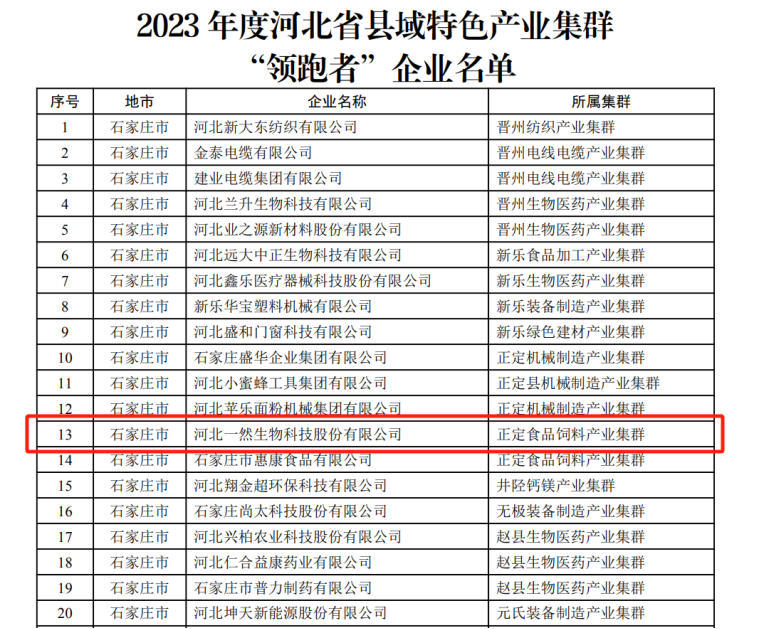 12月8日,2023年度河北省县域特色产业集群“领跑者”企业名单和首批“领跑者”企业调整名单的通知发布。根据《河北省县域特色产业集群“领跑者”企业培育工作指南》,按照企业入库培育、自愿申报、市县审核推荐、专家评审和网上公示。河北k8凯发官网生物科技股份有限公司荣登2023年度河北省县域特色产业集群“领跑者”企业名单。